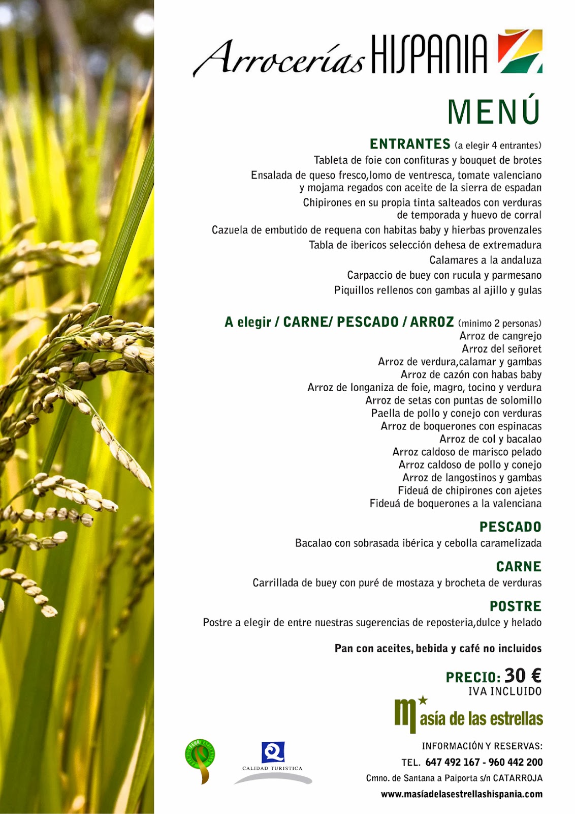 Con motivo de la celebración de las Ferias Cevisama, Habitat y Maderalia bajo la marca común #NosVemosEnValencia (http://nosvemosenvalencia.com/) del 11 al 15 de febrero en Feria Valencia hemos preparado un menú especial disponible desde hoy lunes 10 hasta el próximo domingo 16 de febrero en nuestros establecimientos de Arroceria Hispania Beniparrell, Arroceria Hispania Masia de las Estrellas y Taperia Hispania